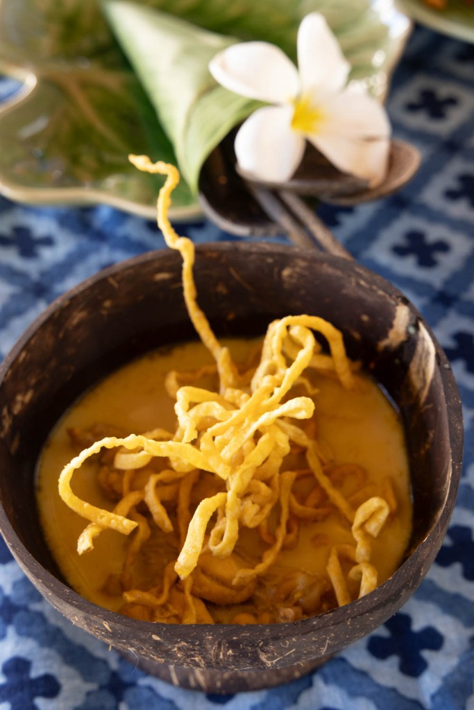 We made EVERYTHING. We made papaya salad, khao soi. We made curries from chili paste we made from scratch. We made fried flowers, and learned to wrap with banana leaves. We made dessert, and ate it too.