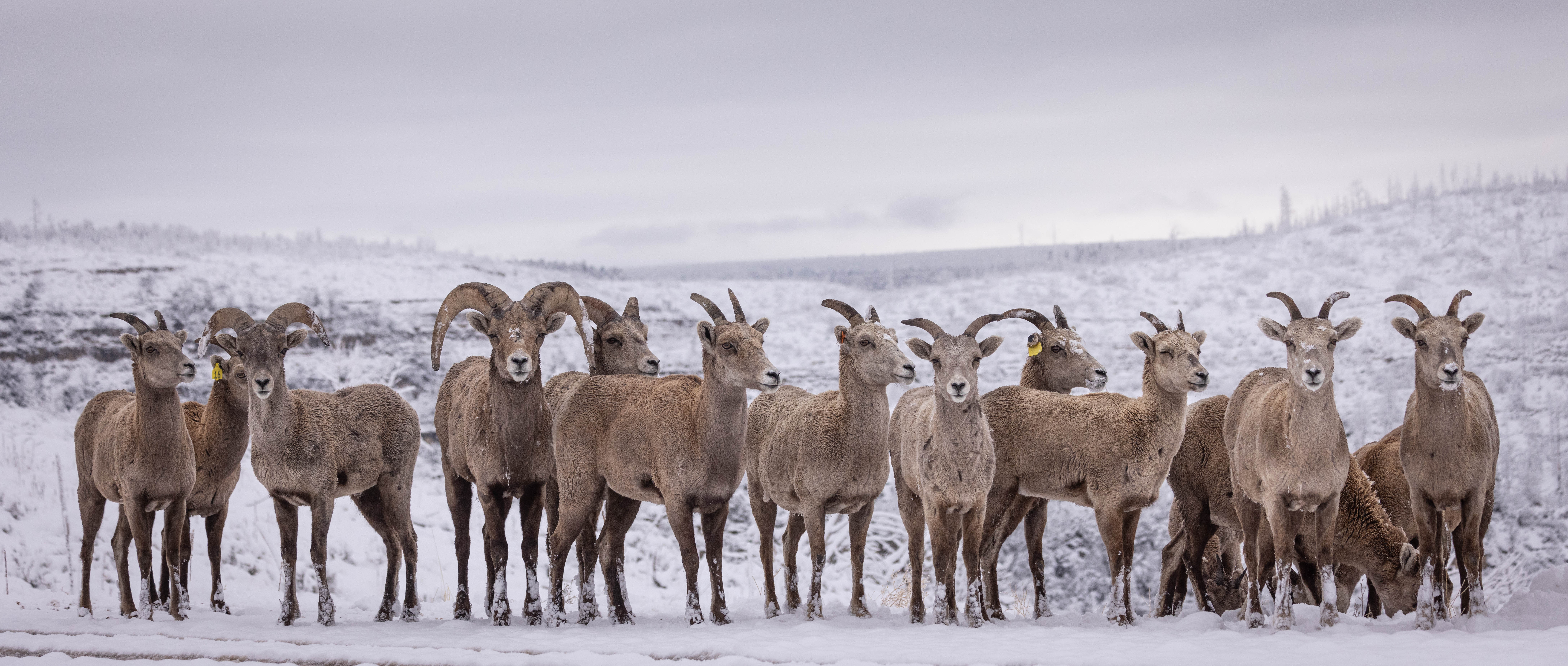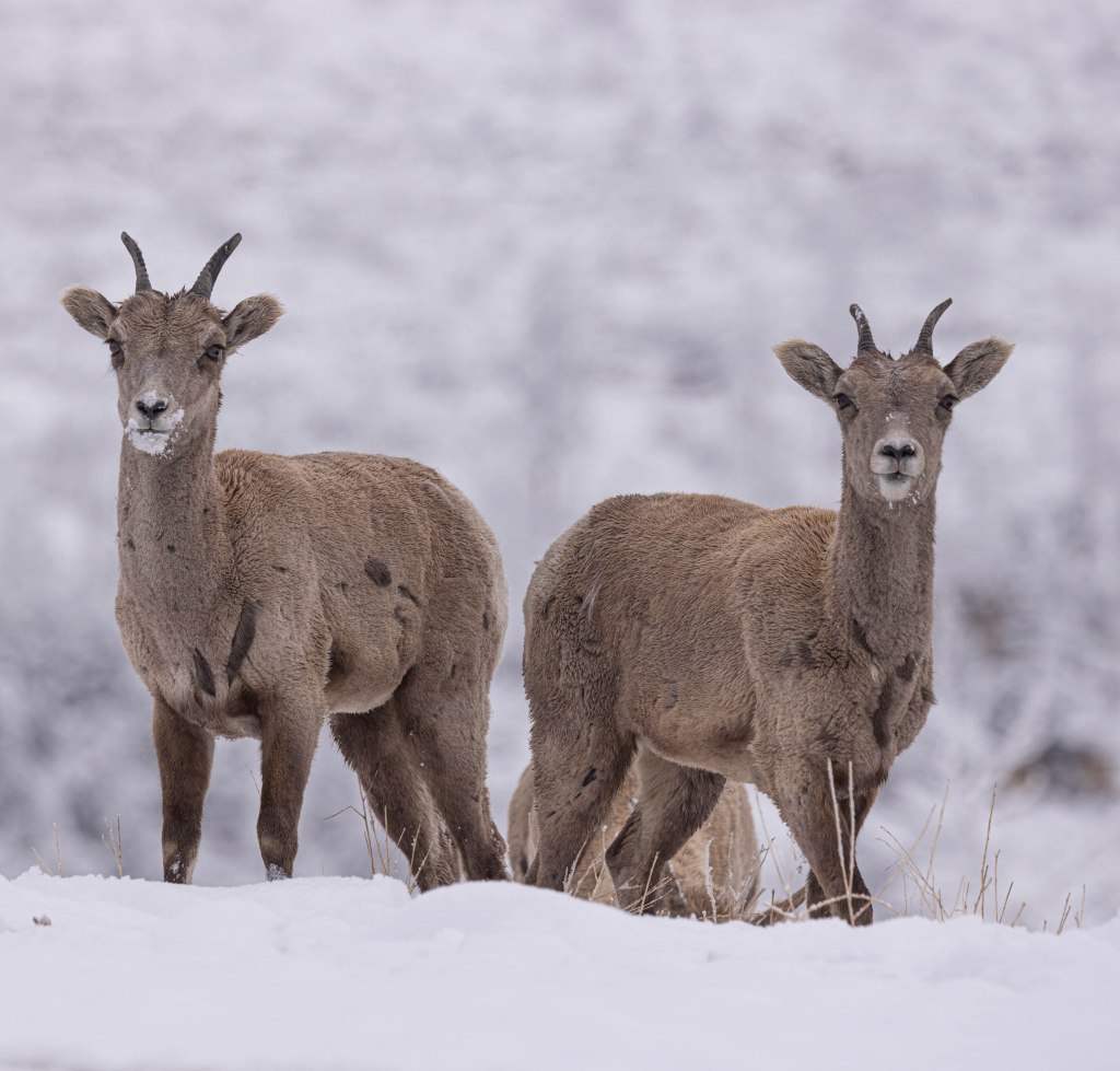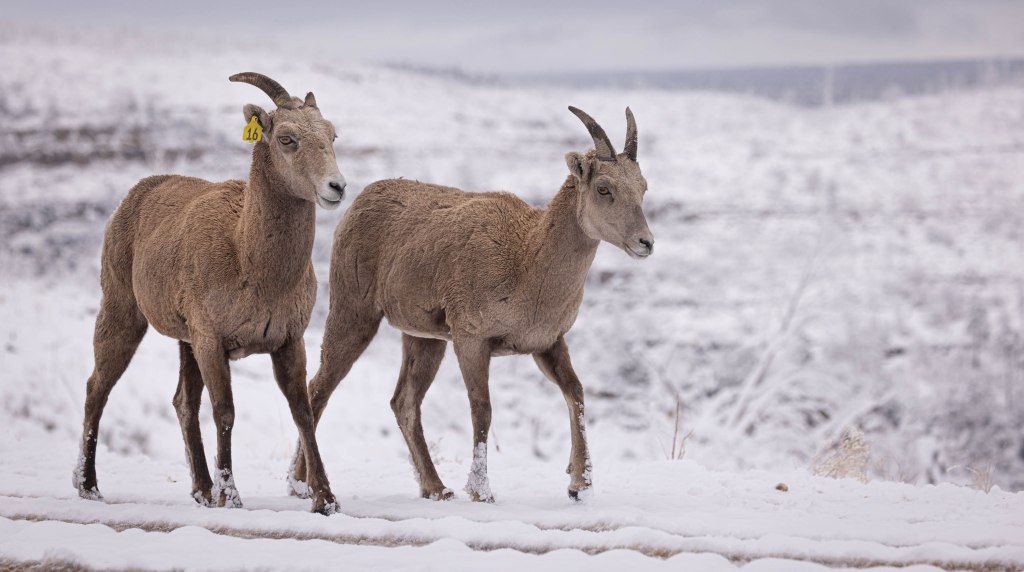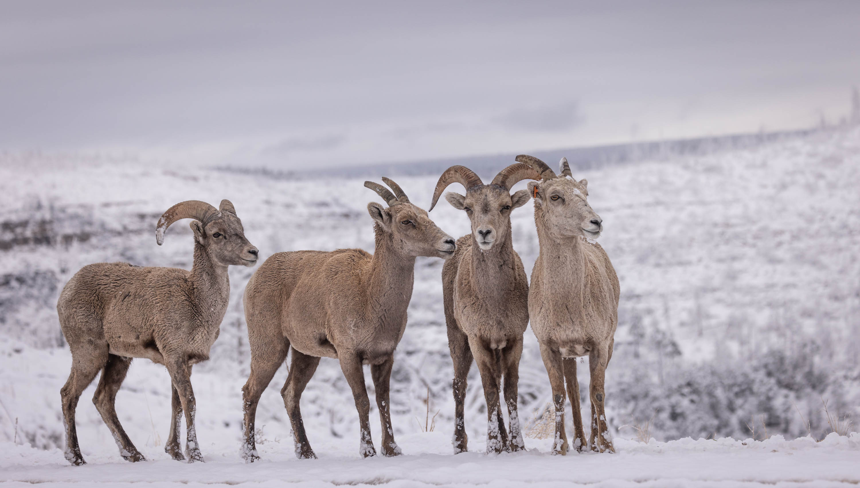 We were out looking for animals in the snow (see my post here … https://kritterspaw.com/2025/04/19/let-the-snow-fall/ ). We were fortunate enough to encounter a herd of big horn sheep munching on the grass as they dug through the snow to get to it.