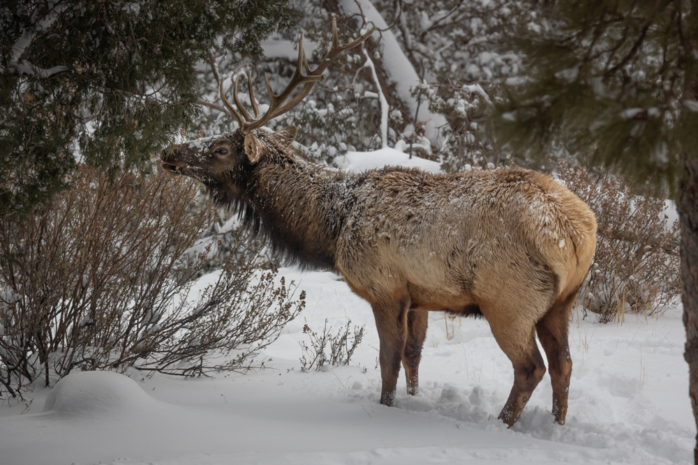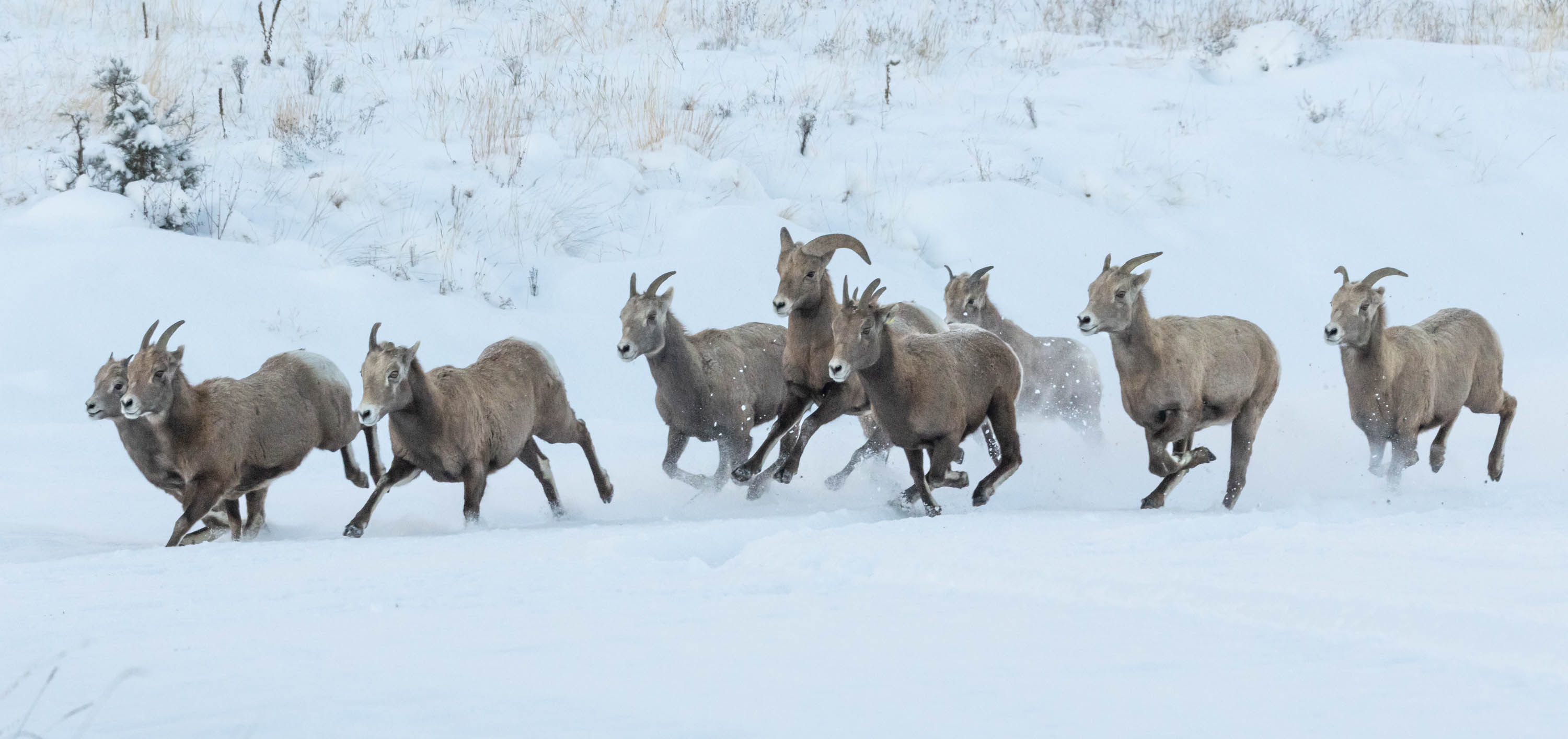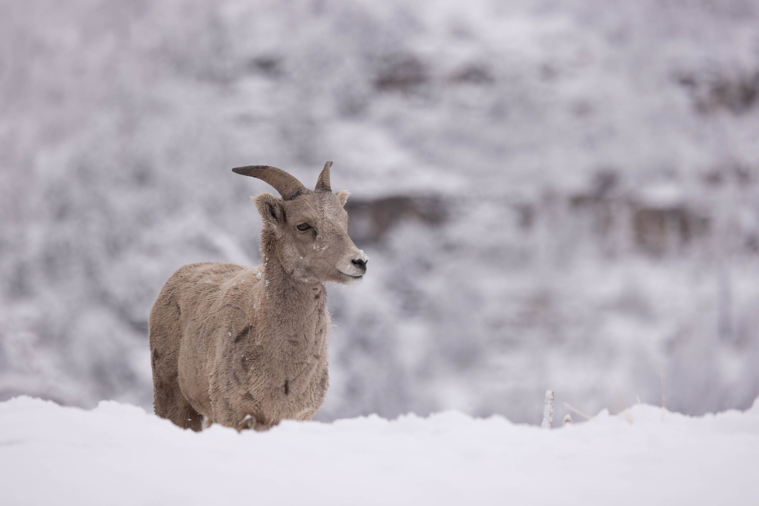 We were out looking for animals in the snow (see my post here … https://kritterspaw.com/2025/04/19/let-the-snow-fall/ ). We were fortunate enough to encounter a herd of big horn sheep munching on the grass as they dug through the snow to get to it.