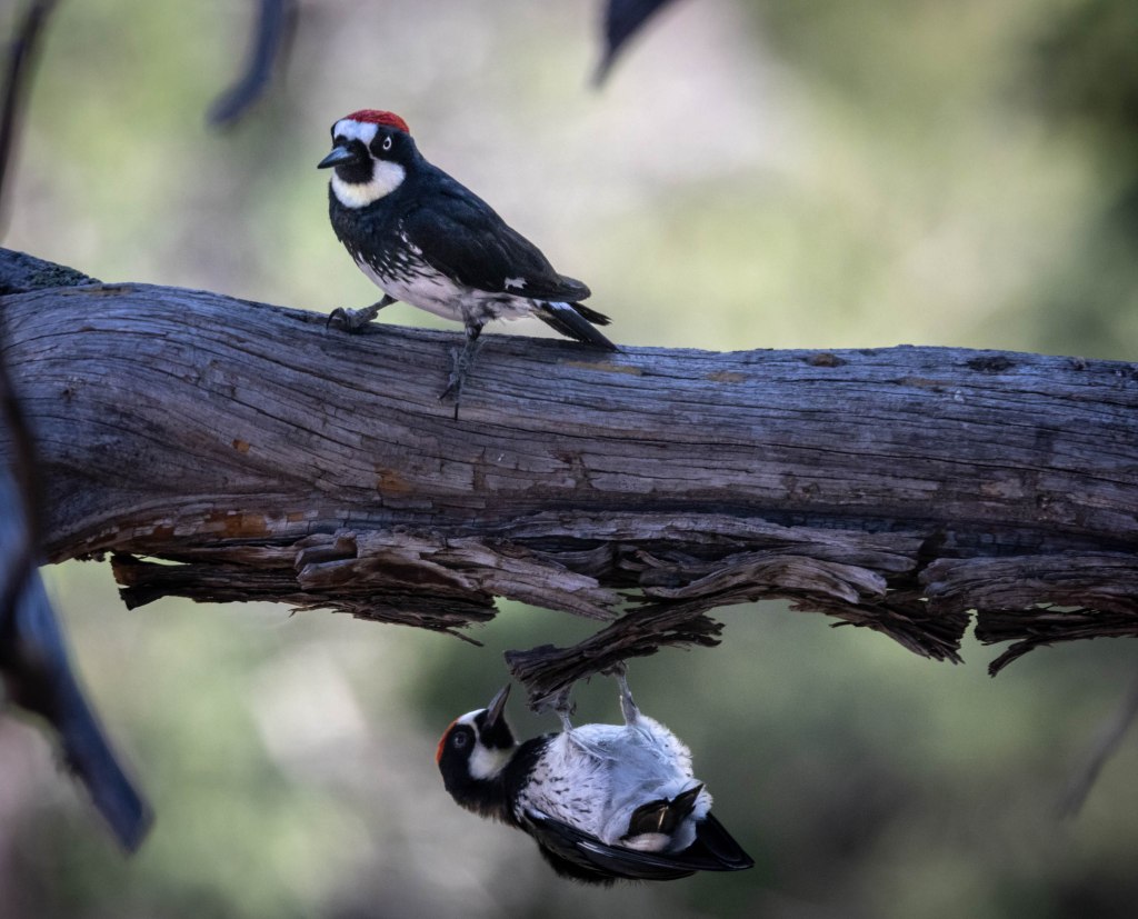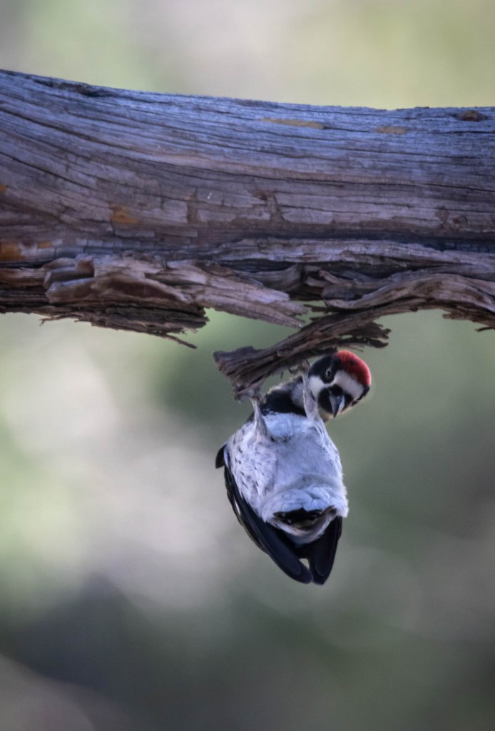 The red-headed acorn woodpecker eats nuts (acorns), seeds, and insects. They burrow in bark and trees to bury their food for later. It’s fascinating to watch the parent teaching the babies early on to squirrel away seeds to eat later.