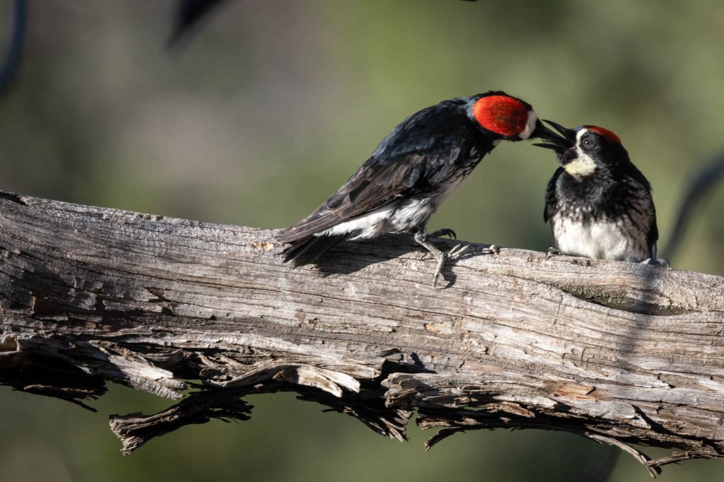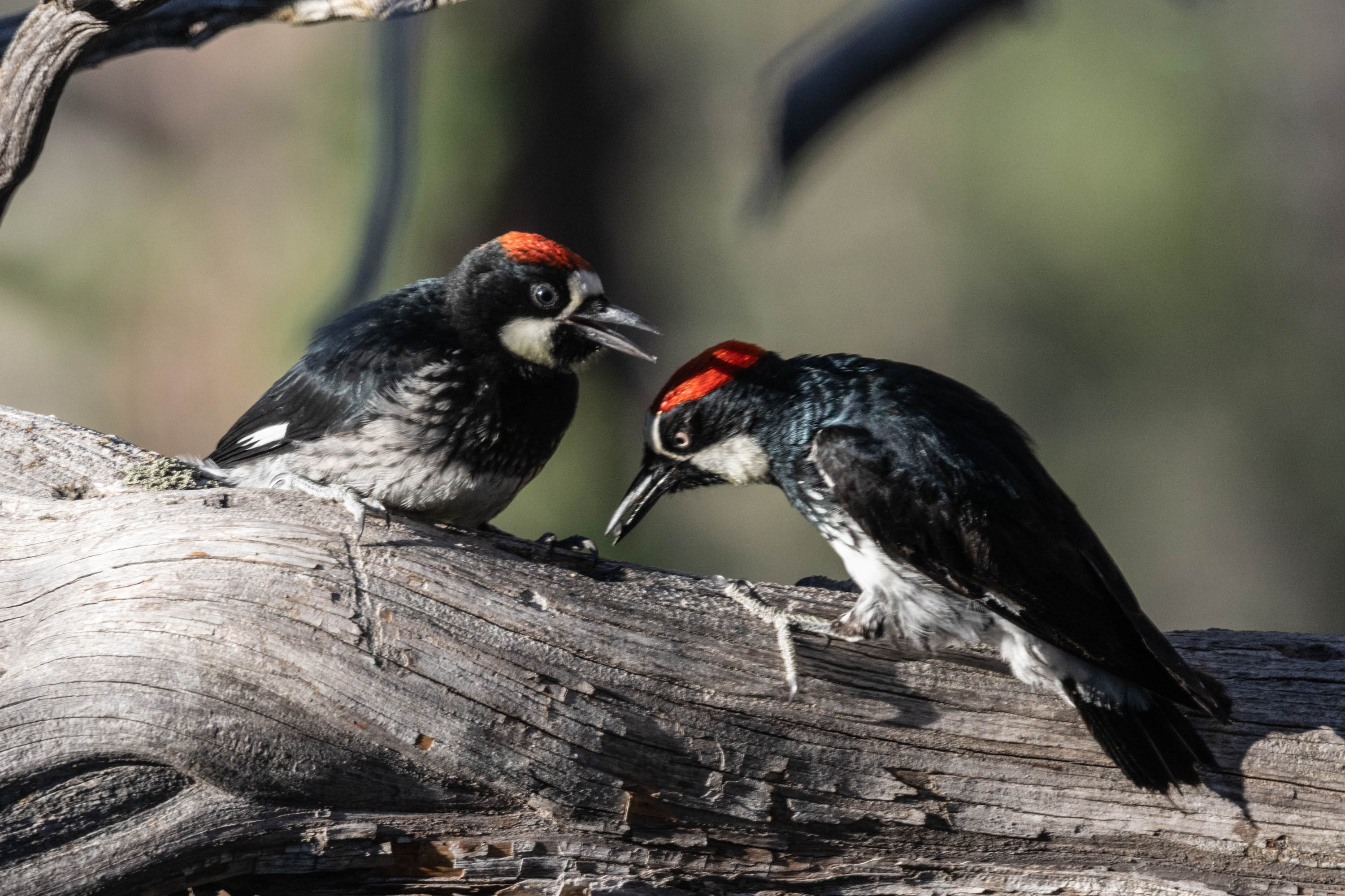 I am always astounded by how big, and how quickly baby birds grow to be full size. I caught these baby acorn woodpeckers being fed by mom.