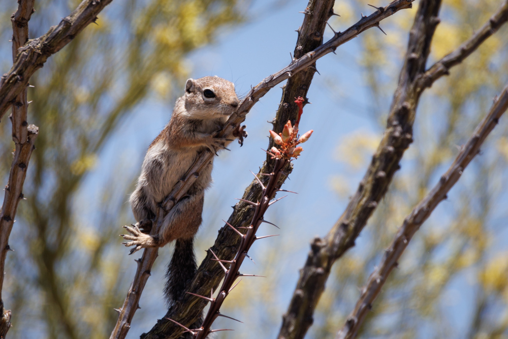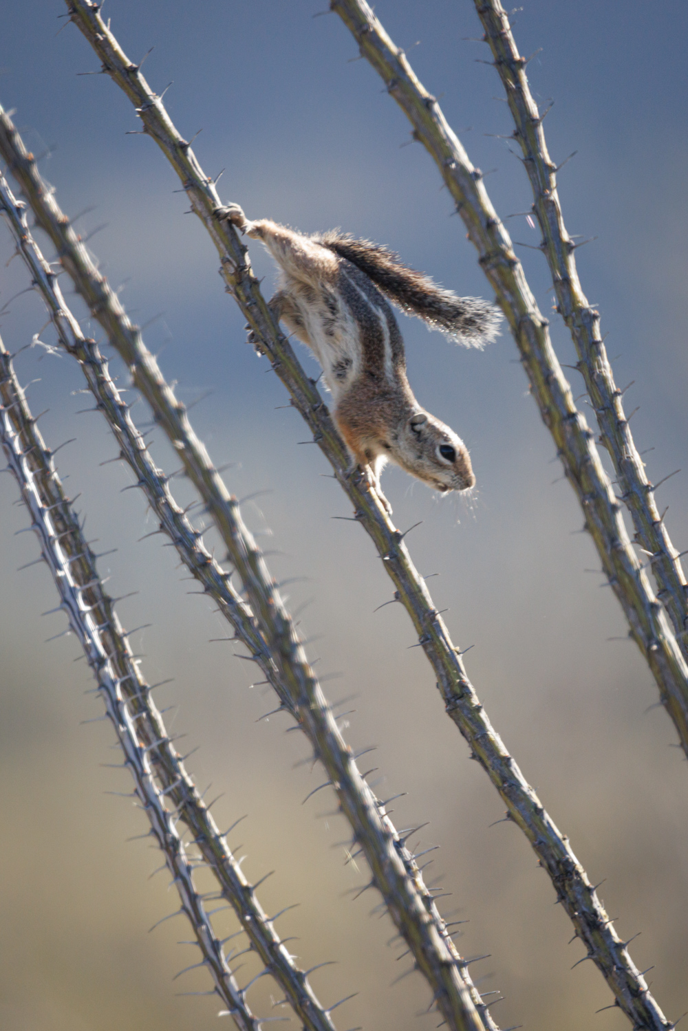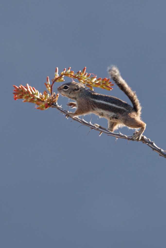 At Tucson Mountain Park we were delighted and entertained as we watched these little ground squirrel brave the ocotillo thorns just for a taste of it’s ‘candy corn’ fruit.