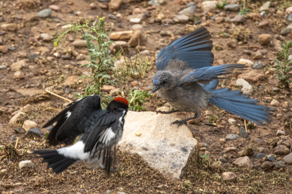 Western Bluebird and Acorn Woodpecker vie for kernel of foodWestern Bluebird, female
