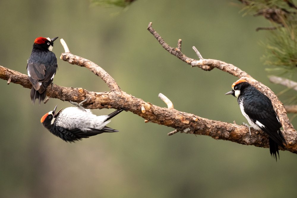 I am always astounded by how big, and how quickly baby birds grow to be full size. I caught these baby acorn woodpeckers being fed by mom.